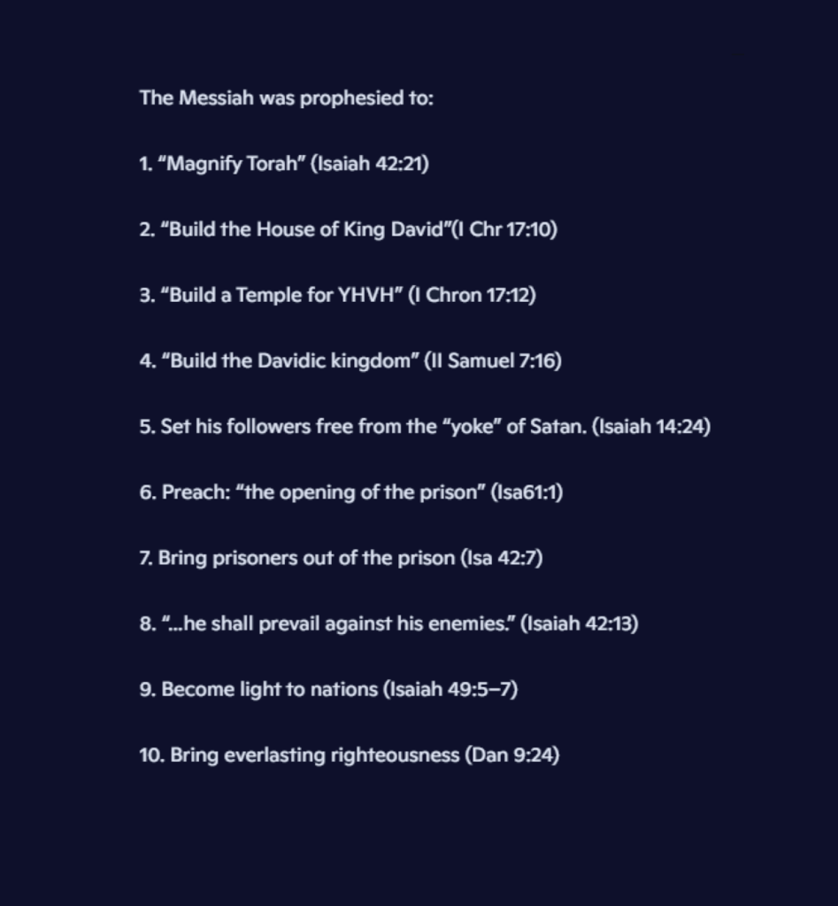 Here is a starter 10 “Messianic Prophecies” That Describe What the Messiah Would Do, we will expand this list next.