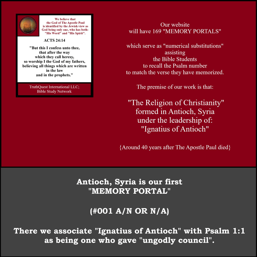 Mnemonic Anchor: Antioch, Syria Suite Code: A/N or N/A = #001 Psalm Link: Psalm 1 — “Blessed is the man who does not walk in the counsel of the ungodly…”As an example of what to do, associate “Antioch, Syria” with these “Church Fathers” at the 326 A.D. Council of Nicaea. Psalm 1 praises that man who rejects the council of ungodly men. These men went against God’s “Kingdom of God” movement and perverted it, turning it into a denominational Church movement. You are blessed if you reject their advice and follow The Apostle Paul’s doctrines and practices. The story could be that you win a free trip to vacation in Antioch, from The Roman Catholic Church there. When you arrive, they take you to their museum and show you their exhibit of the Council of Nicaea. They praise the decision to replace Passover with Easter, and to turn The Jewish Messiah; “Yeshua”, into their God and founder; “Jesus Christ”. They tell you, a Torah compliant Jew, that the only way to Heaven when you die is to renounce Torah, and be baptized into “The True Church”. Father Anthony and Sister Nancy take you to the next exhibit of “Ignatius of Antioch” and show you all the great quotes they have displayed from his writings.