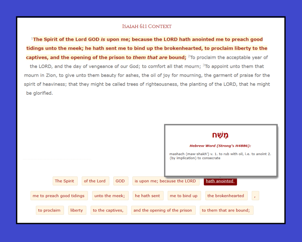 The title of “Christ” is the English word for the Greek translation of the Hebrew title: “Messiah”. There are over 100 really key “Messianic Prophecies”, and Isaiah 61:1 is one of the most important ones.