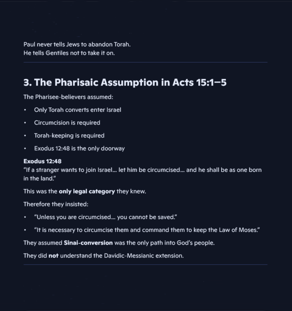 Gentiles enter the House of David through the Isaiah 49:6 extension — not through Torah conversion — and Paul is the apostle who reveals and administers this doorway, which the Pharisee‑believers of Acts 15:1–5 did not understand.