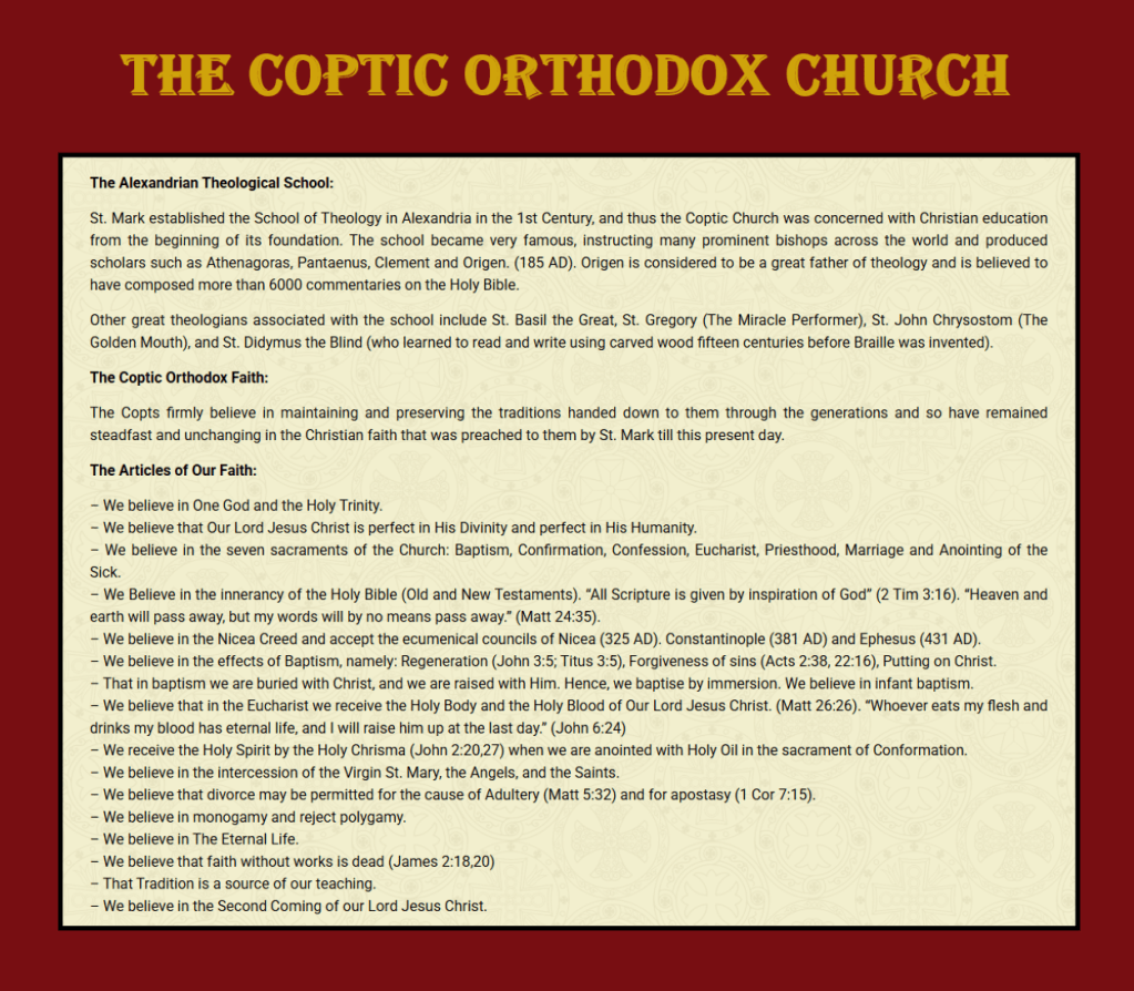 2. Greek Orthodox Patriarchate of Alexandria – Also claims the same apostolic foundation by St. Mark. – Shares the same early history as the Coptic Church until the split after the Council of Chalcedon (451 AD). – Maintains its own succession of patriarchs from the same original see.