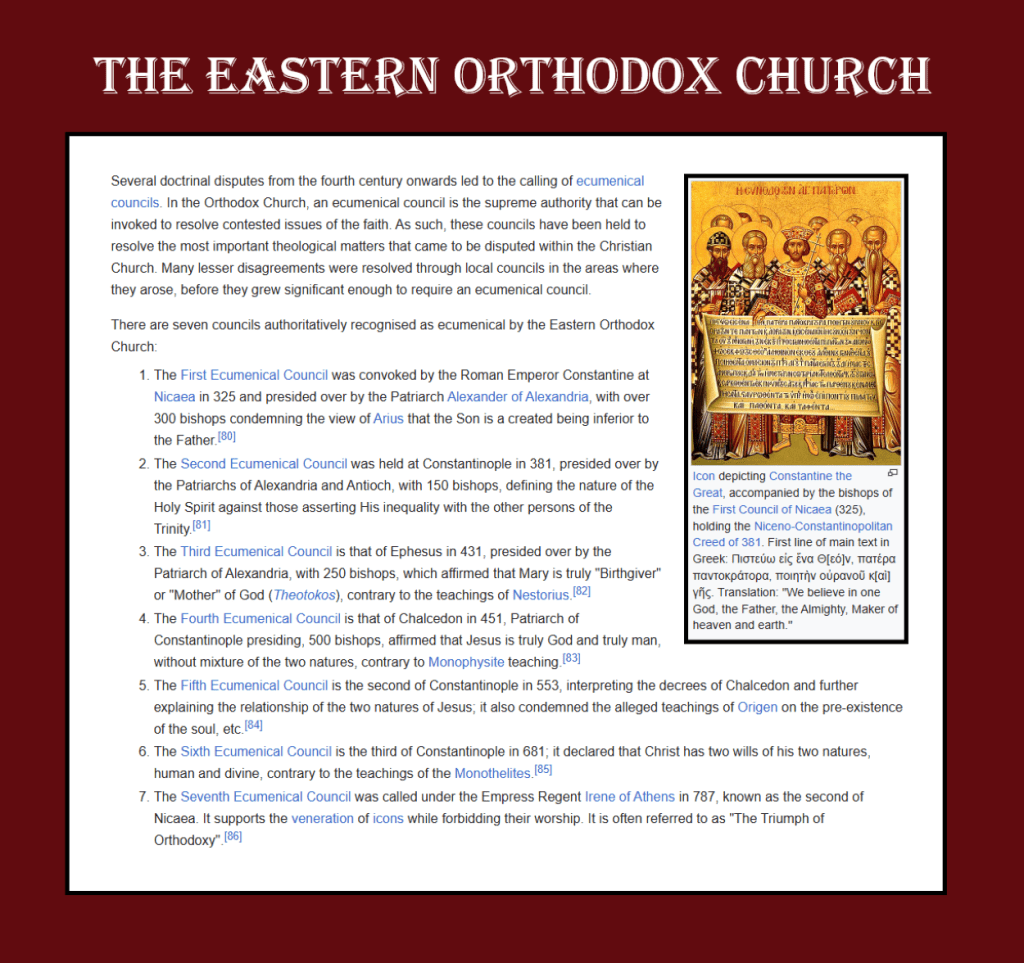 The Eastern Orthodox Church accepts all seven “Church Councils”. They teach that they are “The True Church” that Jesus founded in Matthew 16:18 because the Apostle Andrew personally evangelized the region around ancient Byzantium. According to their tradition, Andrew ordained the first bishop of the city, establishing the apostolic foundation of what later became the Patriarchate of Constantinople.