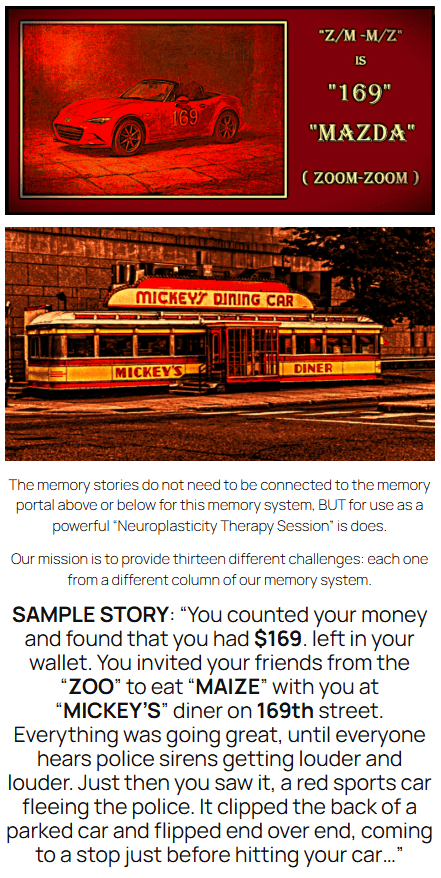 This feat is accomplished by creating a powerful memory story that have the Memory Anchors of both passkeys. Our first story will connect M/Z or Z/M #169 “MAZDA” to M/Y or Y/M #156 “MICKEY”.