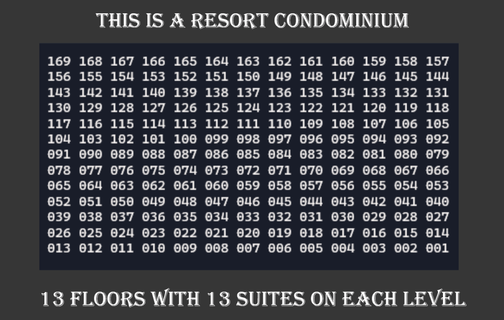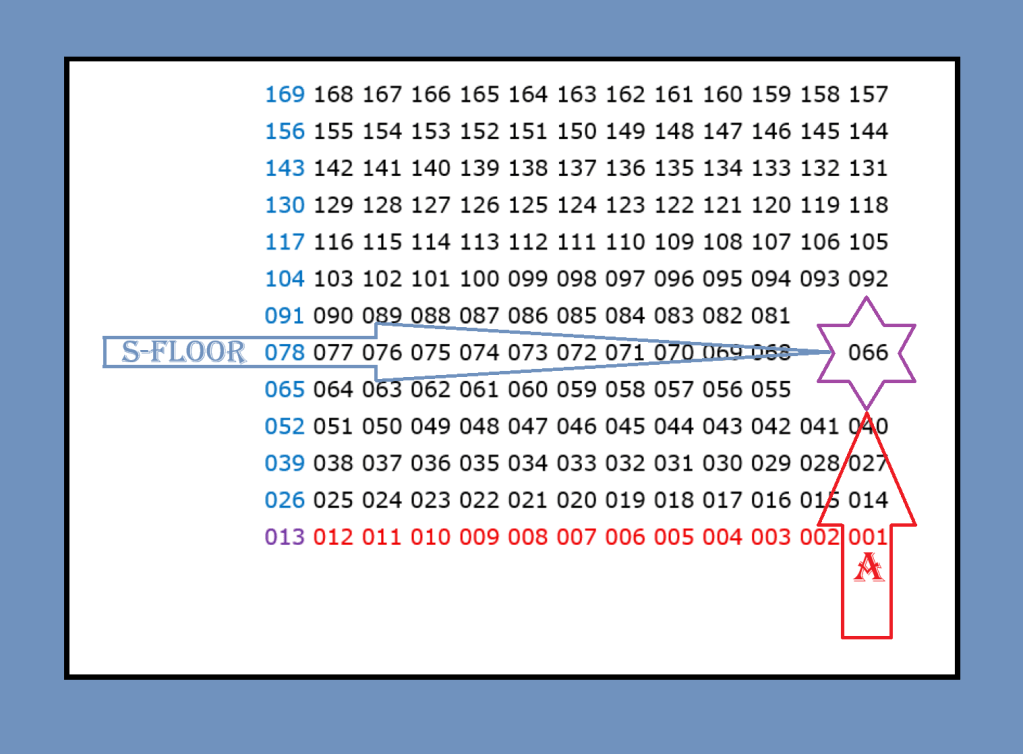 Every floor is numbered the same. The lowest number is above the โAโ, and the highest number is above the โMโ. These 13 numbers make up the โN-Floorโ.