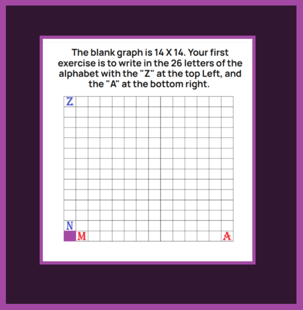 The blank graph is 14 X 14. Your first exercise is to write in the 26 letters of the alphabet with the โZโ at the top Left, and the โAโ at the bottom right.